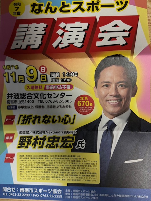 11月9日 井波総合文化センターで、14時から柔道家 野村忠宏 「折れない心」講演会があります。