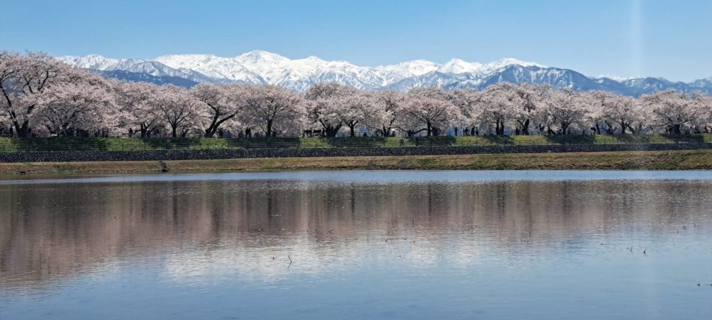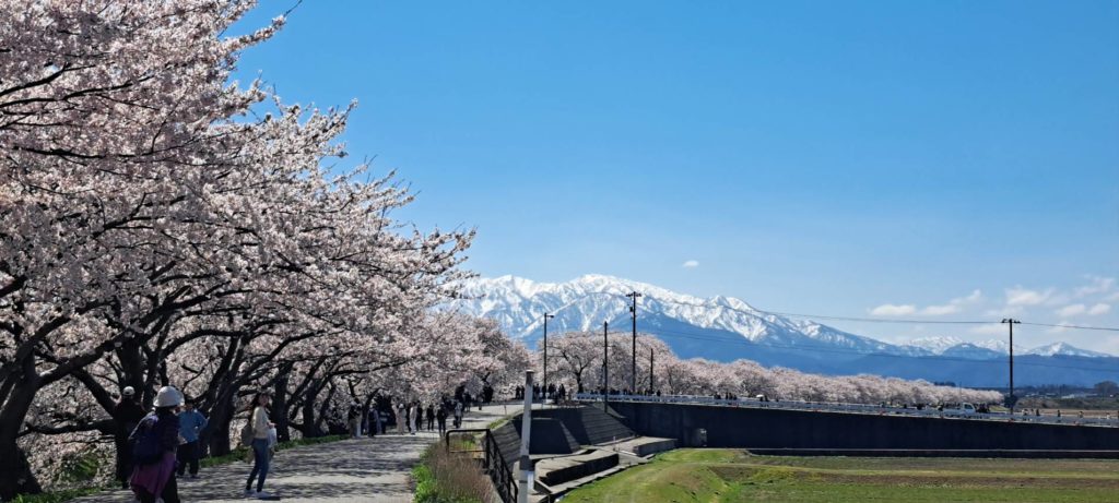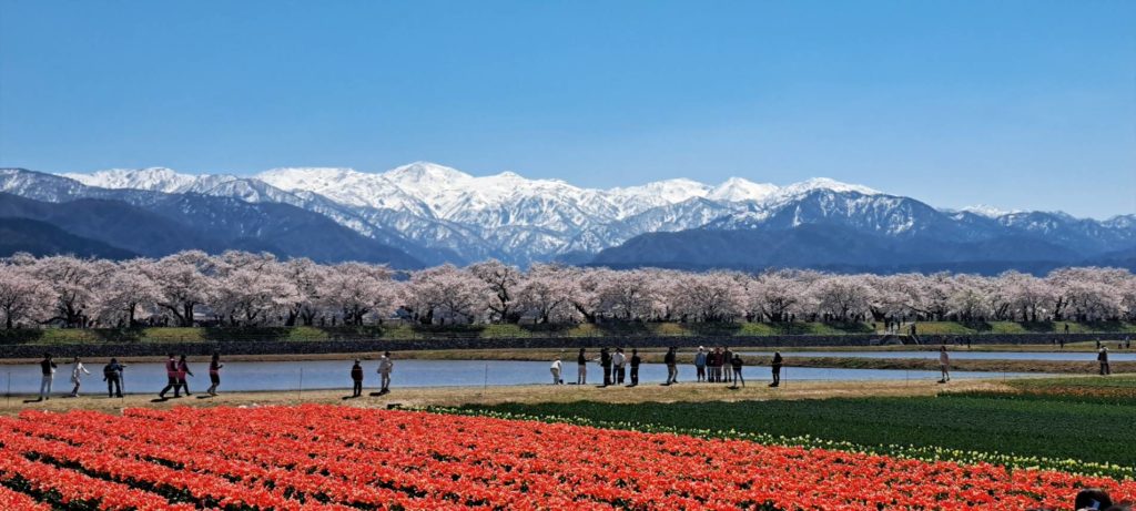 満開の桜とチューリップはもちろん、雪を抱えた朝日岳・雪倉岳・白馬岳・僧ヶ岳は快晴の青空に映え素晴らしい景色でした。